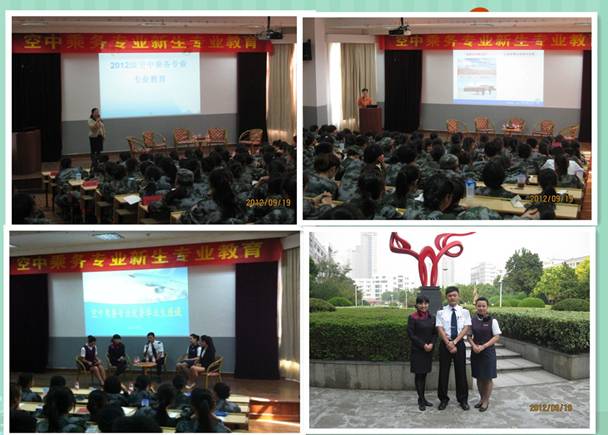 2012年9月19日上午8时,空中乘务专业2012级新生专业教育在学院一号报告厅顺利召开。此次专业教育由空乘教研室主任吕娜老师主持,包含空乘专业教育、行业专家讲座和空乘专业优秀毕业生座谈三个环节。民航与旅游分院院长助理黄华老师,空乘教研室朱慧琴、徐晔、吕串等专业老师参加了此次会议。